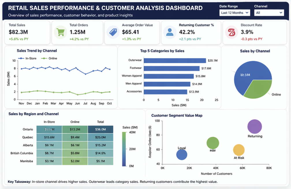 - Compared in-store and online sales performance.
